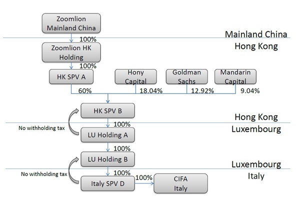 • HK中有3個投資方進(jìn)入,Zoomlion HK Holding和 HK SPV B的存在確保了不管投資方如何變動,香港往上到中國和香港向下到盧瑟堡的結(jié)構(gòu)不會受影響。