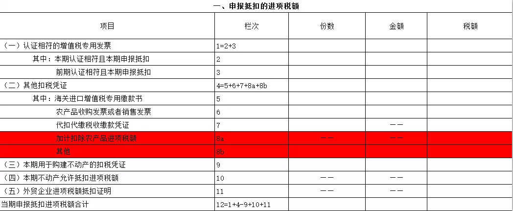 ?。ǘ对鲋刀惣{稅申報表附列資料(二)》(本期進(jìn)項稅額明細(xì))中的第8欄"其他"欄次調(diào)整為兩欄,分別為"8a行加計扣除農(nóng)產(chǎn)品進(jìn)項稅額"和"8b行其他"。