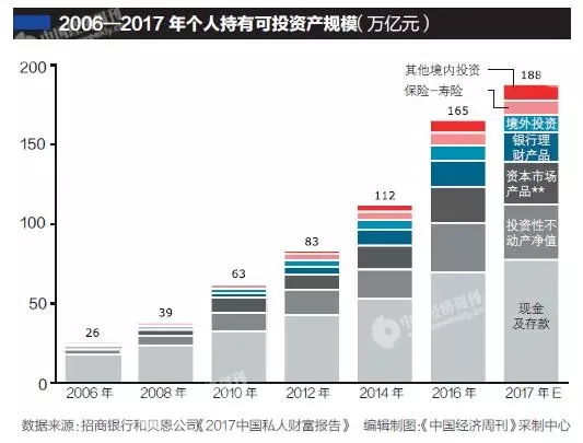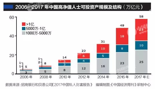 招行和貝恩的報告預計,2017年高凈值人群持有財富總量將達58萬億元,同比增長19%,人均擁有3670萬元可投資資產。中國私人財富市場總體處于快速增長階段,具有巨大增長潛力和空間。