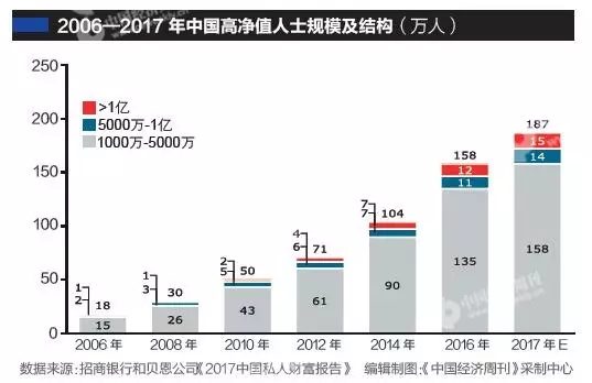 根據(jù)招行和貝恩的報告,高凈值人士的數(shù)量從2006年的18萬人增長到2016年的158萬人,相當于過去11年間,每天有接近400張“新面孔”躋身高凈值人士行列。