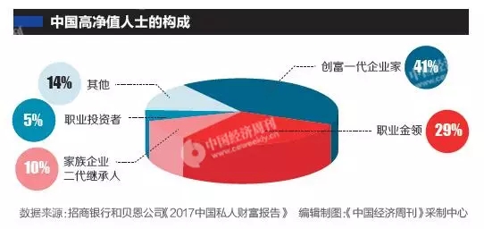 招行和貝恩的報告顯示,41%是創(chuàng)富一代企業(yè)家,29%是職業(yè)金領,10%是家族企業(yè)二代繼承人,5%是職業(yè)投資者,14%是其他。這里的“其他”包括全職太太、運動員、演員、畫家等社會名流。