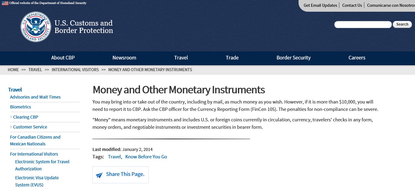 美國(guó)海關(guān)及邊境保護(hù)局(CBP)規(guī)定,游客攜帶超過1萬美元現(xiàn)金、旅行支票或者其它貨幣等,都須向海關(guān)申報(bào),并對(duì)現(xiàn)金的來源作出合理解釋,例如現(xiàn)金如果來自所出售房產(chǎn),務(wù)必出示出賣房產(chǎn)的憑據(jù)等。如不申報(bào),當(dāng)事人最高可面臨50萬美元的罰款及10年以上有期徒刑。